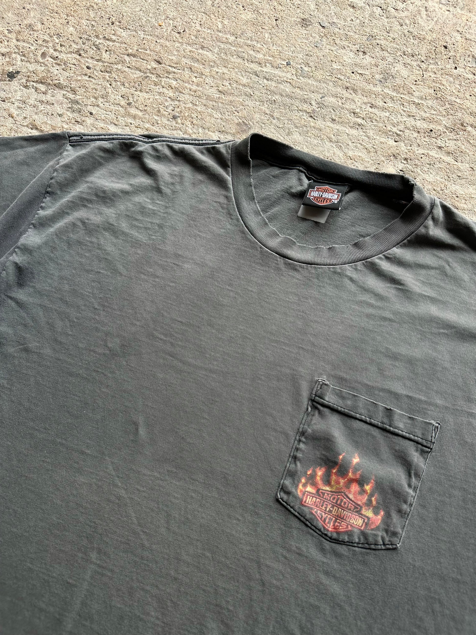 Perfect 1990's Harley Davidson flame pocket merch shirt with wear to match.