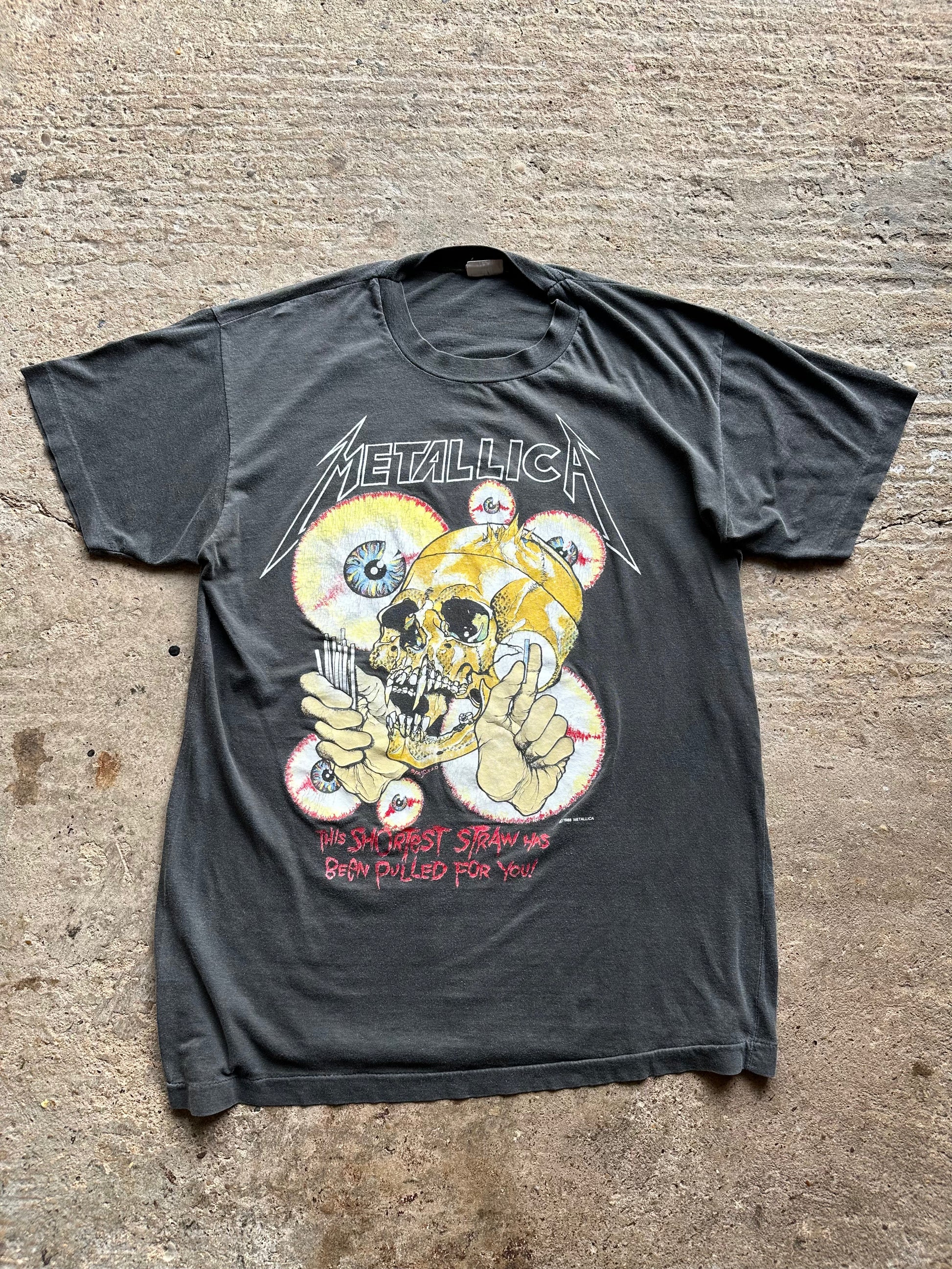 Iconic Metallica 'Shortest Straw' promo shirt from 1988 with Pushead graphics.
