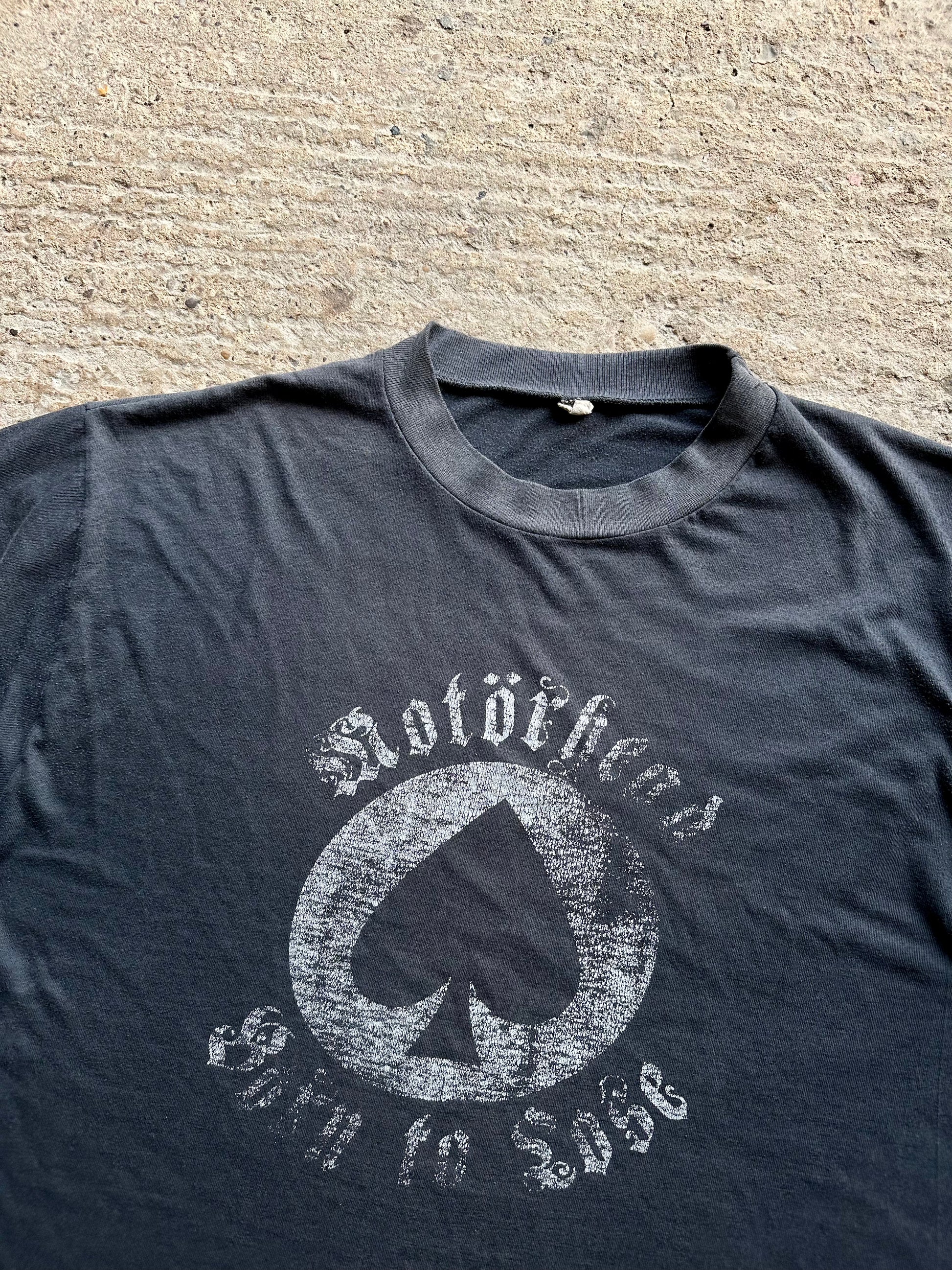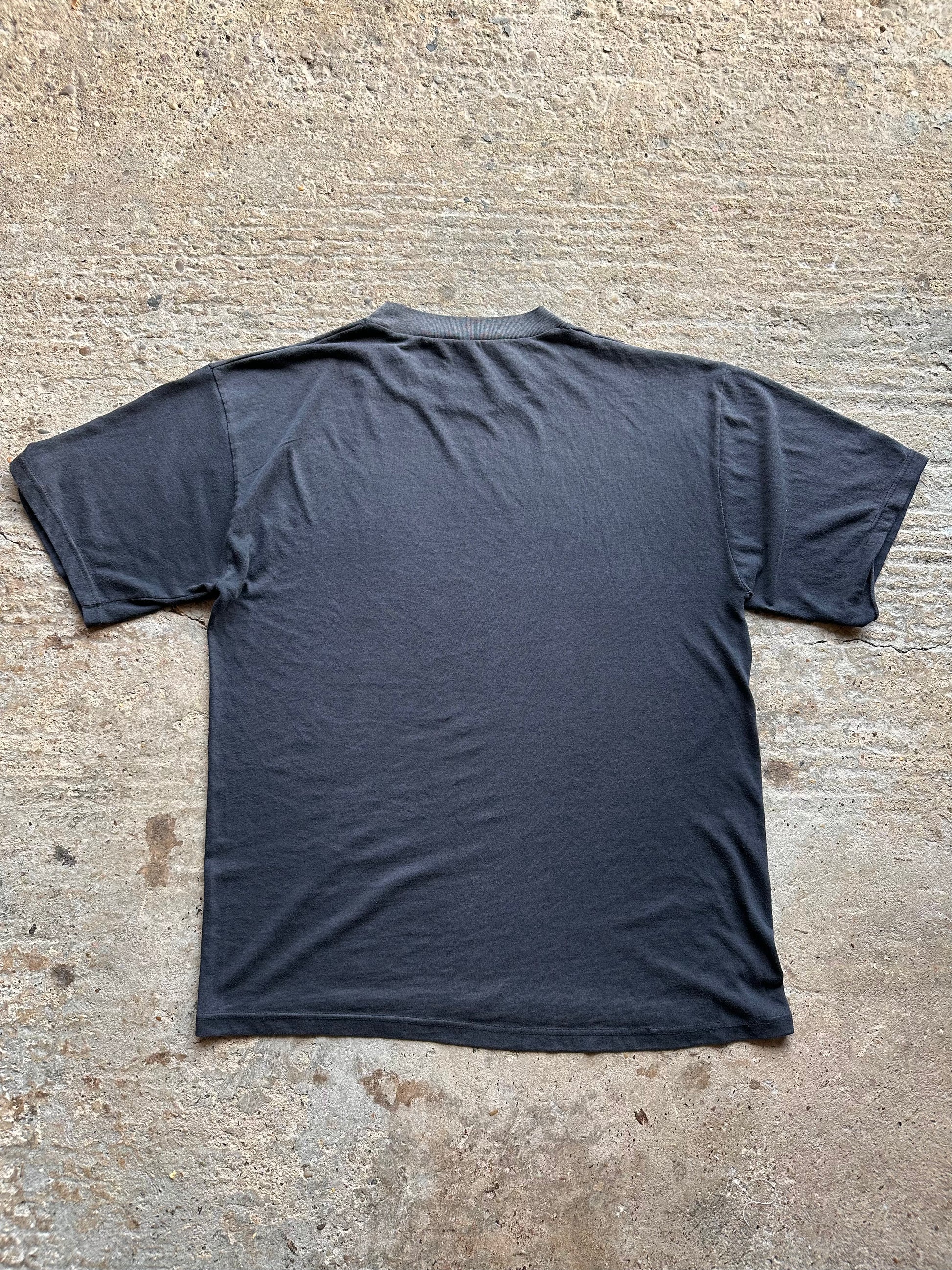 Super soft, thinned and faded. Heavy wear to print. One underarm split.
