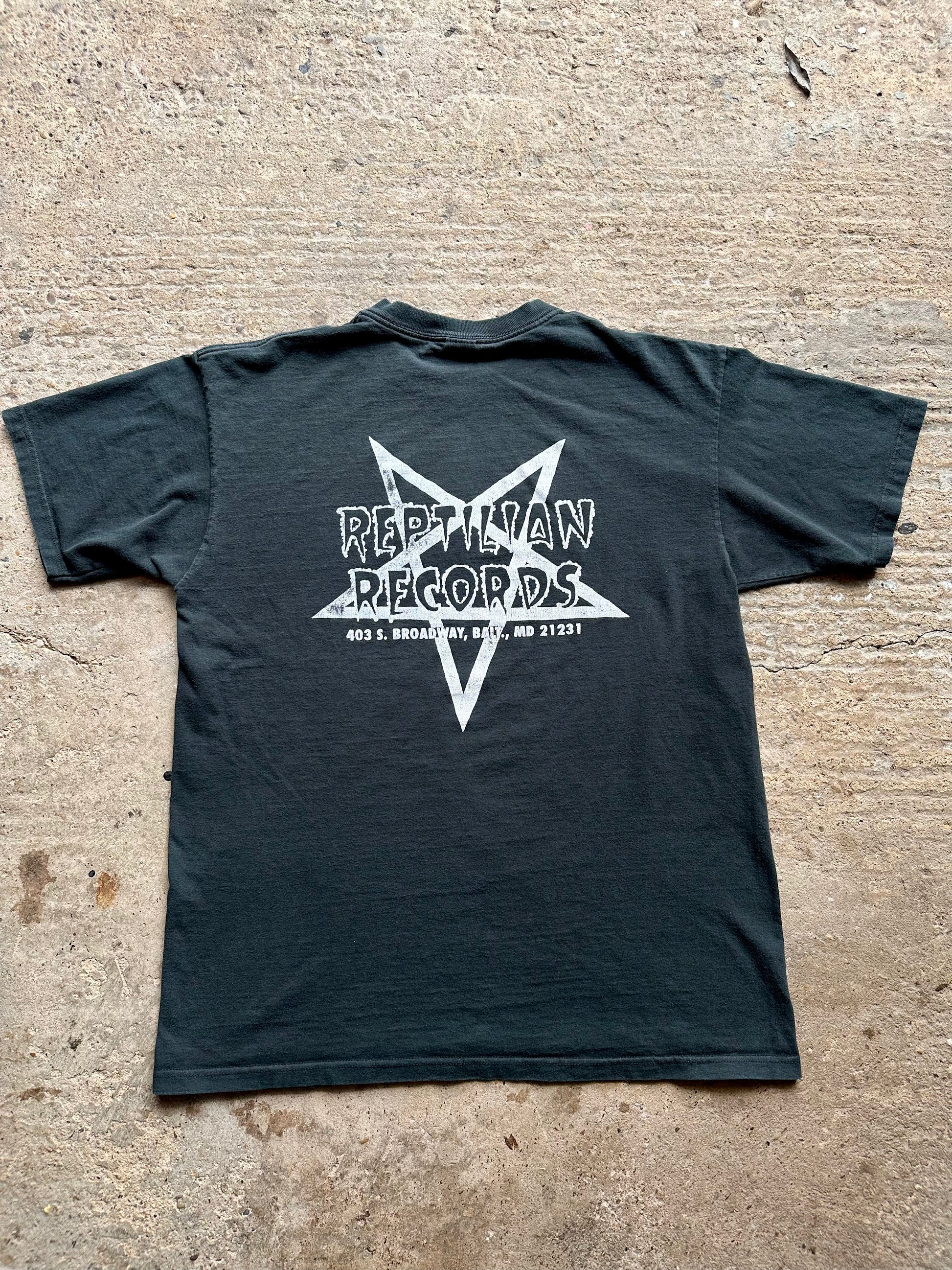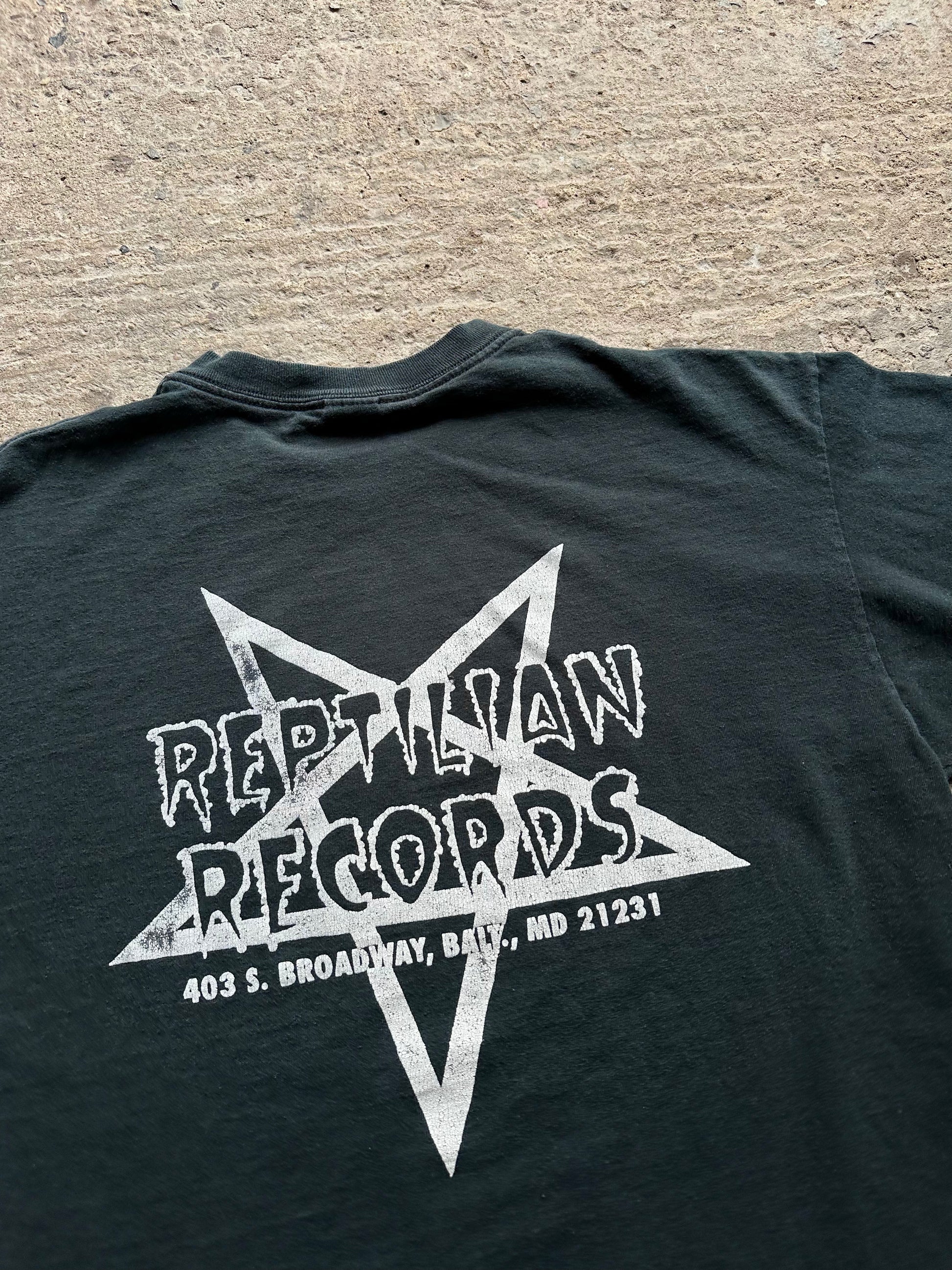 Early 2000's Reptilian Records slogan print graphic promo shirt.