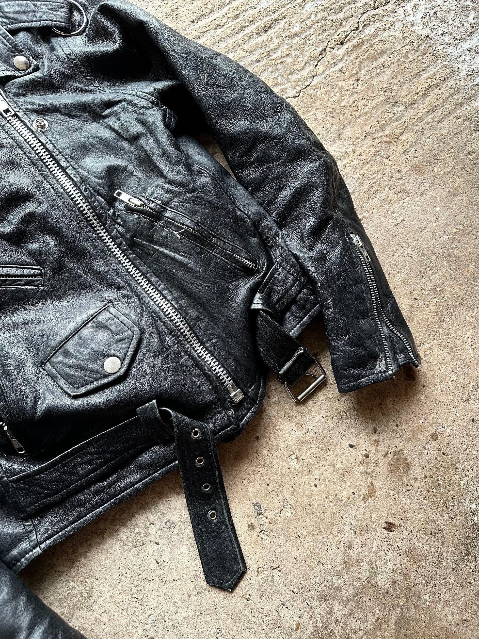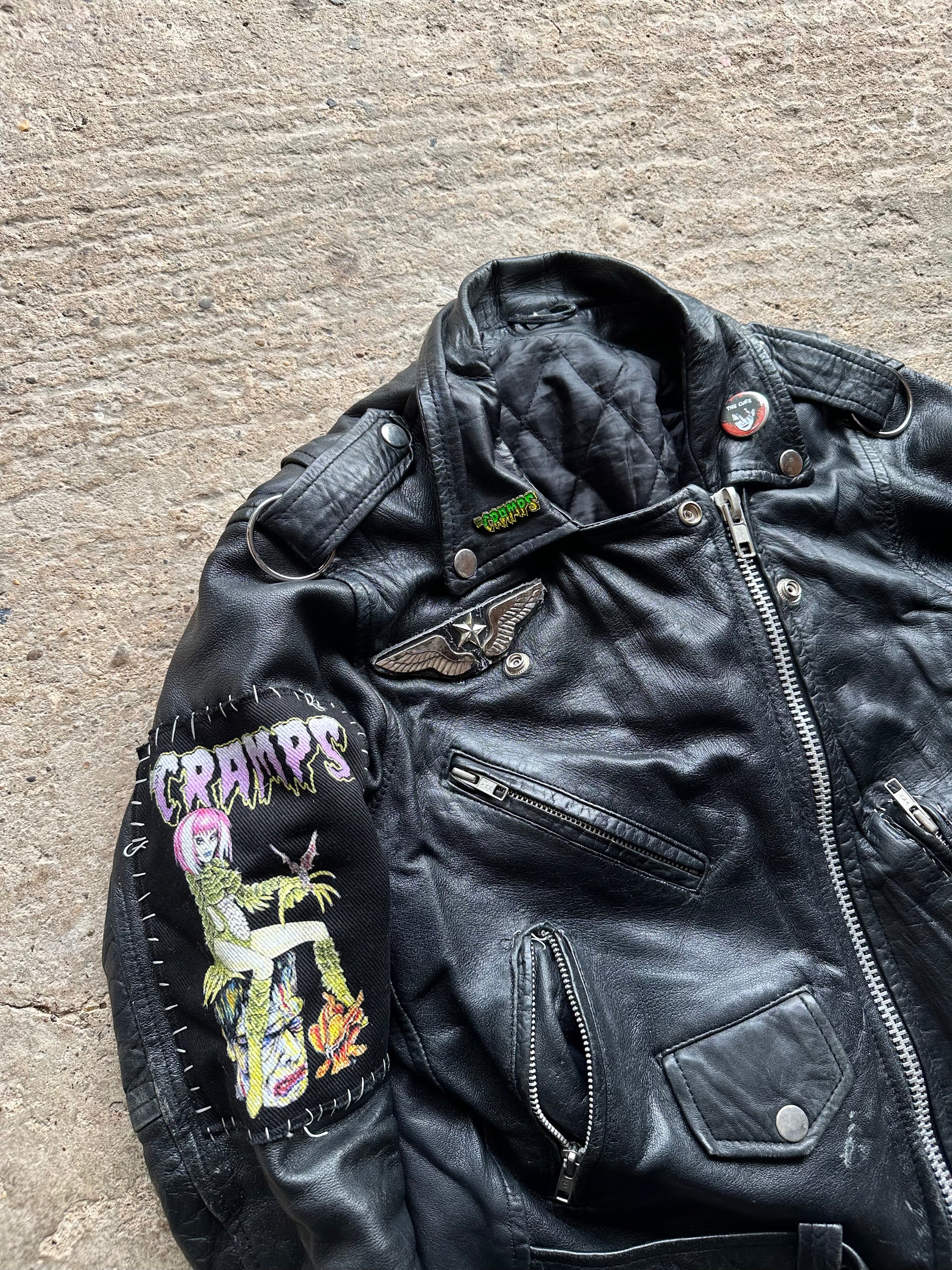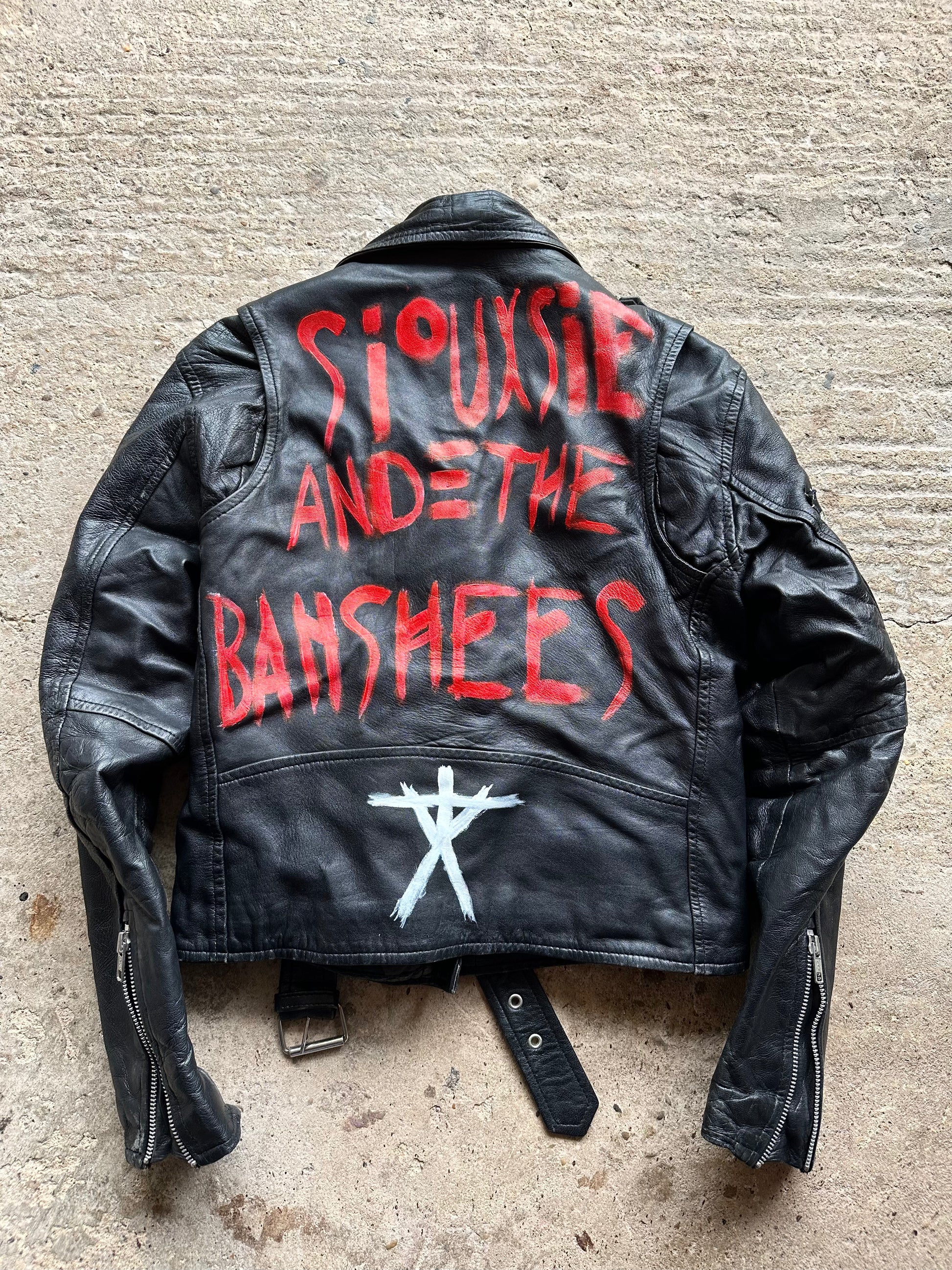 Vintage leather jacket with badges, sew on patch and pins. Large hand painted Siouxsie And The Banshees rear print.